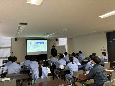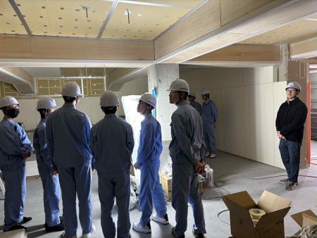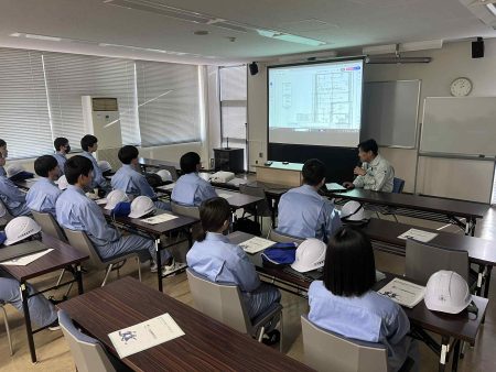 15名の生徒の皆さまに参加していただき、弊社の紹介と施工管理の業務内容説明、実際に稼働している建築現場や過去に施工させていただいた施設の見学などを実施しました。